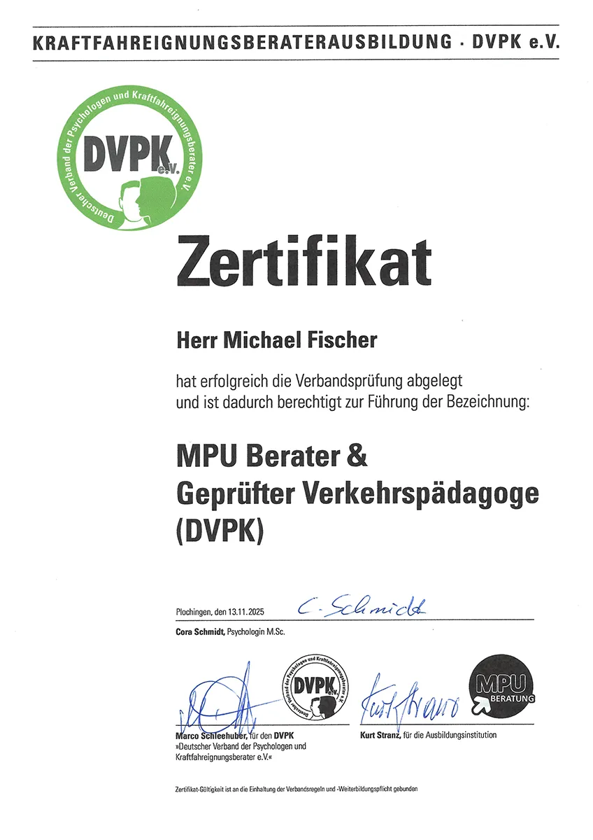 AUSGEZEICHNET Basierend auf 19 Bewertungen Gepostet auf Mandy GrossTrustindex überprüft, ob die Originalquelle der Bewertung Google ist. Wir danken Herrn Fischer sehr für die super Vorbereitung ! Wir empfehlen Eins Komma Eins gerne weiterGepostet auf Andy AuerswaldTrustindex überprüft, ob die Originalquelle der Bewertung Google ist. Ich kann die MPU-Vorbereitung hier uneingeschränkt empfehlen! Das gesamte Team ist äußerst professionell, verständnisvoll und unglaublich hilfsbereit. Von Anfang an habe ich mich gut aufgehoben gefühlt. Die Beratung war sehr individuell und auf meine persönliche Situation zugeschnitten. Man hat sich wirklich die Zeit genommen, alle meine Fragen ausführlich zu beantworten und mir die Angst vor der MPU zu nehmen. Besonders hervorheben möchte ich die Struktur der Vorbereitung. Die Inhalte wurden klar und verständlich vermittelt, und ich habe genau gelernt, worauf es bei der MPU ankommt. Die simulierten Prüfungsgespräche waren Gold wert - dadurch konnte ich meine Argumente festigen und souveräner auftreten. Dank der hervorragenden Unterstützung habe ich meine MPU auf Anhieb bestanden! Ich bin wirklich dankbar für die kompetente Begleitung und würde diese Vorbereitung jedem empfehlen, der vor der MPU steht. Vielen Dank nochmal an das gesamte Team!Gepostet auf Tobias HoraufTrustindex überprüft, ob die Originalquelle der Bewertung Google ist. Ich habe nur positive Erfahrungen gesammelt, sehr freundlich und hat mich bei allem gut beraten und unterstützt. Absolut zu empfehlenGepostet auf Nils KresseTrustindex überprüft, ob die Originalquelle der Bewertung Google ist. Ab dem ersten Gespräch habe ich gemerkt, dass ich bei Herrn Fischer in guten Händen bin. Die Beratung ist erstklassig und absolut empfehlenswert. Aufgrund der gründlichen Vorbereitung, konnte ich vollkommen gelassen zur MPU gehen, und am Ende ging das psychologische Gespräch auch in kürzester Zeit über die Bühne. Sollte ich die Fahrerlaubnis mal wieder verlieren(was natürlich nicht passiert!) werde ich wieder zu EINS-KOMMA-EINS gehen =DGepostet auf Max FrohnTrustindex überprüft, ob die Originalquelle der Bewertung Google ist. Eins Komma Eins kann man vorbehaltlos weiter empfehlen. Herr Fischer nimmt sich sehr viel Zeit für jedes Anliegen. Wenn jemand seinen Führerschein wieder haben möchte, dann nur mit Eins Komma Eins!Gepostet auf Franz FriesrichTrustindex überprüft, ob die Originalquelle der Bewertung Google ist. EINS-KOMMA-EINS ist das beste was mir passieren konnte. Habe bei anderen Anbietern mir Angebote eingeholt und die waren bei 2000 € und mehr. Jetzt habe ich meinen Führerschein endlich wieder und das sogar ohne Abstinenz. Freundlich, Kompetent und man fühlt sich einfach gut aufgehoben. Kann ich jedem nur empfehlen.Gepostet auf Josi SchrödterTrustindex überprüft, ob die Originalquelle der Bewertung Google ist. Alles zu meiner vollsten ZufriedenheitGepostet auf Richard WeberTrustindex überprüft, ob die Originalquelle der Bewertung Google ist. Fühle mich an diesem Ort sehr wohlGepostet auf Patrick GrügerTrustindex überprüft, ob die Originalquelle der Bewertung Google ist. Hab mich sehr kompetent und stets gut beraten gefühlt.Kann ich jeden bedenkenlos empfehlen.Gepostet auf Daniel SchreiberTrustindex überprüft, ob die Originalquelle der Bewertung Google ist. Sehr gute MPU Vorbereitung, nicht wie bei den meisten nur online möglich, obwohl das auch geht. Ansprechpartner vor Ort im Büro oder auch bei 20 km Entfernung kommt er persönlich nach Hause. Und das alles ohne Extrakosten. Vielen Dank für alles ich kann und werde Sie nur weiterempfehlen!